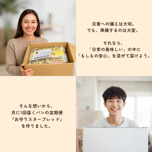 【 定期便をご購入のお客様へ】 定期便のお申し込みには、安全に継続決済を行うための「Pay ID」への無料アカウント登録が必須となります。 (※システムの都合上、クレジットカード情報の入力が2回求められる場合がございますが、二重請求にはなりませんのでご安心ください!) 【重要:お届けエリアについて】 本商品は鮮度を保つため、発送からお届けまでにお時間がかかる沖縄県および北海道・本州・四国・九州の「離島地域(佐川急便の中継料金発生地域)」への配送は承っておりません。 誠に恐れ入りますが、あらかじめご了承いただけますようお願い申し上げます。 新潟から心を込めてお届けする「お守りスターブレッド」は、毎日の美味しい食卓と災害時の備えができる商品です。 このセットには、ふんわりとした食感のスターブレッドが2本含まれており、濃厚な味わいと香りが楽しめます。 定期的に届くので、自然とローリングストックができます。 また、万が一の備えとして役立つ防災4コマ漫画と、心温まるメッセージカードがセットになっており、大切な人にエールを送るのにぴったり! プチギフトやお礼の品としても喜ばれる商品です。特に、新生活を始める方にもおすすめです。 【初回限定キャンペーン中!】 今ならクーポンのご利用で初回お届け分が 2,480円! ※2回目以降は通常価格(¥2,980)での継続となります。 ■お届けサイクル 月に1回のお届けになります。毎月11日発送予定です。 ※土日祝の場合は休み前の最終平日に発送します。 (発送予定日:4/10、5/11、6/11、7/10、8/11、9/11、10/9、11/11、12/11、1/11、2/11) ■お届け内容 スターブレッド2本、季節の防災4コマ漫画、メッセージカード ※スターブレッドは4種類のフレーバー(ミルク、チーズ、ショコラ、くるみおさつ)の中から味が重ならないように順番にお届けします。 4/10発送分はミルクとくるみおさつです。 ※メッセージ送付をご希望の方は「新潟仕送り部公式LINE」にご登録いただき、LINEよりメッセージの登録をお願いします。 ■スターブレッドについて 使用されている素材は厳選されたシンプルな自然素材で、安心して食べられます。 「マルシャン」独自の生地の配合・製法や特別な包装技術により、固くなる・カビが生えるなどパンの老化現象を遅らせております。 防腐剤等は一切使用しておりません。 安心してお召し上がりいただけます 1本の大きさ、原材料、保存方法については画像をご確認ください。 ※食物アレルギーをお持ちの方は、原材料を必ずご確認ください。 ■ お手入れ/取り扱い注意事項 お守りスターブレッドは冷暗所での保存を推奨しています。開封後は早めにお召し上がりください。 防災4コマ漫画は、火の元から遠ざけて保管してください。 ■ 発送・注文に関する情報や注意事項 ・ご注文はオンラインショップで承っており、通常毎月11日に発送いたします。 ・発送日の8日前以降にご注文いただいた場合、在庫状況によっては翌月11日の発送となる場合がございます。 ・定期便のスキップ、停止(解約)を希望される場合は、次回お届け予定日の8日前までにご連絡ください。 ・商品の性質上(生鮮食品)、お客様都合による返品・交換は受け付けておりません。 万が一、お届けした商品に破損や腐敗があった場合は、商品到着後3日以内にご連絡ください。良品と交換させていただきます。 ■ その他 ご不明な点がございましたら、ショップのお問い合わせからお気軽にお尋ねください。 大切な人への思いを込めた贈り物として、「お守りスターブレッド」をぜひお選びください。 運営: NPO法人ふるさと未来創造堂(新潟県長岡市) 製造: 株式会社マルシャン <よくあるご質問> Q: 毎月発送というのは変更できますか? A: お子様の食べるペースに合わせて、お届けの一時停止(スキップ)が可能です。 お申込み後に毎月お送りするメールから簡単にお手続きいただけます。 スキップを希望される場合は、次回お届け予定日の8日前までにお手続きをお願いいたします。 Q: 子供の引っ越し先へ直接届けてもらえますか? A: はい。お届け先にお子様のご住所を、購入者様に親御様のご住所をご登録いただくことで、新潟からお子様の手元へ直接お届けします。 Q: 届くパンの種類は選べますか? A: 申し訳ございませんが、お届けするパンの種類は「新潟仕送り部」にお任せいただいております。毎回同じ味が続いて飽きてしまわないよう、2種類のバリエーションを交互にお届けするなど、お子様が箱を開けるたびに新鮮な喜びを感じられるよう工夫しております。 Q: 「お守り(備蓄)」としてどのように備蓄すればいいですか? A: 古いものから食べて新しいものを補充する「ローリングストック」を推奨しています。 次のパンが届くまでの間、残ったパンは冷凍保存をおすすめします。 冷凍保存する場合は、食べやすい大きさにカットしてラップに包み、ジップロックなどに入れて冷凍庫に入れてください。食べたい時に自然解凍(15~30分)または軽