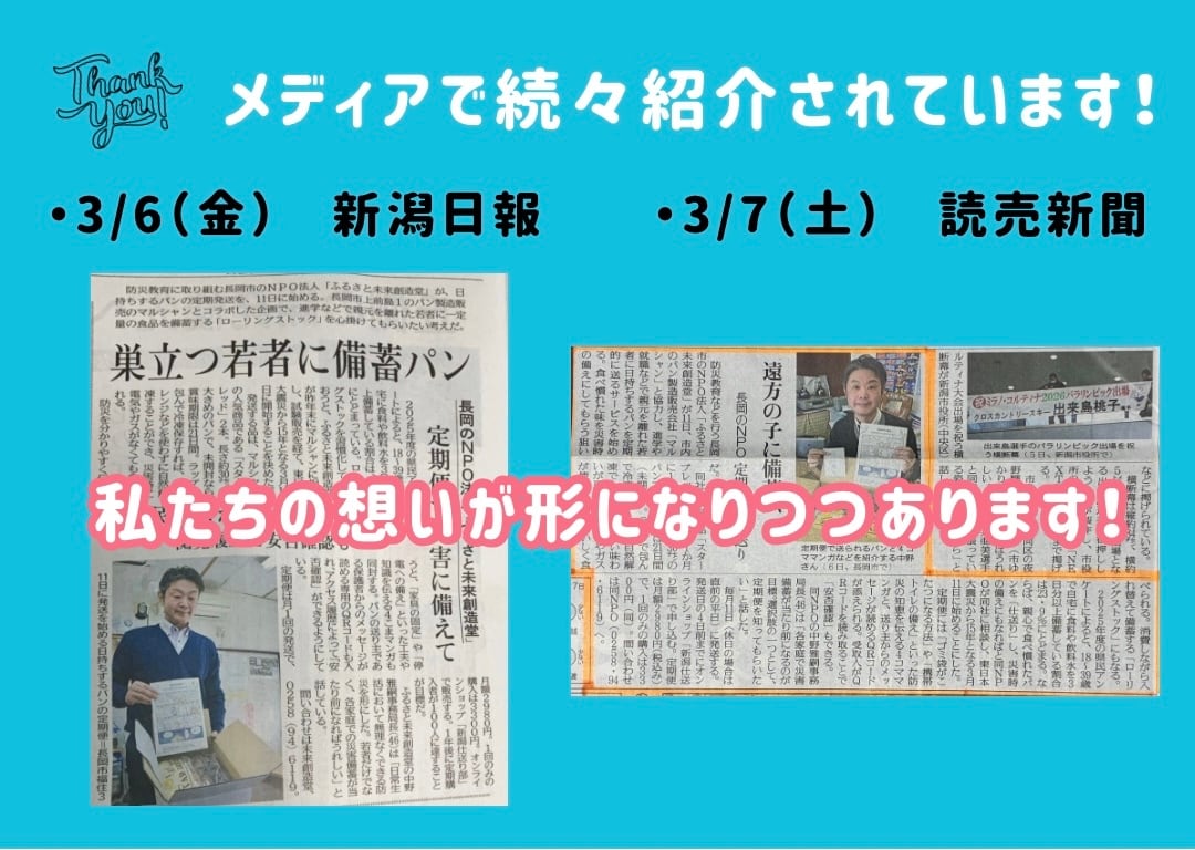 \ メディアに掲載されました! / 防災のプロ「ふるさと未来創造堂」が届ける、新しい仕送りの形として、3/6新潟日報、3/7読売新聞に紹介されました。 【面倒な会員登録は不要!】 単発ギフトは「Pay ID」への登録なし(ゲスト購入)で、今すぐ簡単にご購入いただけます!ネットでの登録作業が苦手な方にも一番人気です 【重要:お届けエリアについて】 本商品は鮮度を保つため、発送からお届けまでにお時間がかかる沖縄県および北海道・本州・四国・九州の「離島地域(佐川急便の中継料金発生地域)」への配送は承っておりません。 誠に恐れ入りますが、あらかじめご了承いただけますようお願い申し上げます。 心を込めた願いを届ける「お守りスターブレッド」は、特別な瞬間を彩るために作られた商品です。 このセットには、ふんわりとした食感のスターブレッドが2本含まれており、濃厚な味わいと香りが楽しめます。 また、万が一の備えとして役立つ防災4コマ漫画と、心温まるメッセージカードがセットになっており、大切な人にエールを送るのにぴったりです。 贈り物やお祝いの品として、特別な気持ちを込めてお届けできます。 ■商品発送日 4月10日(金)に発送します。※定期便ではありません。 ■お届け内容 スターブレッド2本(ミルク、くるみおさつ)、季節の防災4コマ漫画、メッセージカード ※メッセージ送付をご希望の方は「新潟仕送り部公式LINE」にご登録いただき、LINEよりメッセージの登録をお願いします。 ■スターブレッドについて 使用されている素材は厳選されたシンプルな自然素材で、安心して食べられます。 「マルシャン」独自の生地の配合・製法や特別な包装技術により、固くなる・カビが生えるなどパンの老化現象を遅らせております。 防腐剤等は一切使用しておりません。 安心してお召し上がりいただけます 1本の大きさ、原材料、保存方法については画像をご確認ください。 ※食物アレルギーをお持ちの方は、原材料を必ずご確認ください。 ■ お手入れ/取り扱い注意事項 お守りスターブレッドは冷暗所での保存を推奨しています。開封後は早めにお召し上がりください。 防災4コマ漫画は、火の元から遠ざけて保管してください。 ■ 発送・注文に関する情報や注意事項 ご注文はオンラインショップで承っており、定期便ではなく、4月10日の発送となります。 4/2(木)21:00までにご注文いただいた分を当月の発送対象といたします。 商品の性質上(生鮮食品)、お客様都合による返品・交換は受け付けておりません。 万が一、お届けした商品に破損や腐敗があった場合は、商品到着後3日以内にご連絡ください。 良品と交換させていただきます。 ■ その他 ご不明な点がございましたら、ショップのお問い合わせからお気軽にお尋ねください。 大切な人への思いを込めた贈り物として、「お守りスターブレッド」をぜひお選びください。 運営: NPO法人ふるさと未来創造堂(新潟県長岡市) 製造: 株式会社マルシャン <よくあるご質問> Q: 子供の引っ越し先へ直接届けてもらえますか? A: はい。お届け先にお子様のご住所を、購入者様に親御様のご住所をご登録いただくことで、新潟からお子様の手元へ直接お届けします。 Q: 「お守り(備蓄)」としてどのように備蓄すればいいですか? A: 定期便をご利用の方には、古いものから食べて新しいものを補充する「ローリングストック」を推奨しています。 次のパンが届くまでの間、残ったパンは冷凍保存をおすすめします。 冷凍保存する場合は、食べやすい大きさにカットしてラップに包み、ジップロックなどに入れて冷凍庫に入れてください。食べたい時に自然解凍(15~30分)または軽くトーストすると、いつでも美味しくお召し上がりいただけます。 (冷凍保存の目安は約1カ月) Q: メッセージカードはどうやって書けばいいですか? A: 「新潟仕送り部公式LINE」にご登録いただき、商品発送の3日前までにメニューボタンの「メッセージ入力」ボタンからご入力ください。 テキストメッセージ、手書きしたお手紙の画像どちらでも対応可能です。 お届け後にメッセージが開封された時にはご注文者様にLINEでお知らせいたします。 5. 運営・安心感について Q: 「新潟仕送り部」とはどんな団体ですか? A: 防災共育のプロ「NPO法人ふるさと未来創造堂」が運営しています。単なる通販ではなく、離れて暮らす親子の「安心」を支える活動として、地域の企業と協力して運営しています。